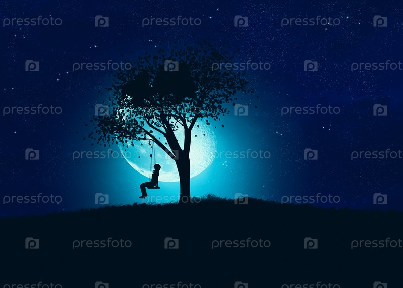 Девушка на качелях под деревом ночью