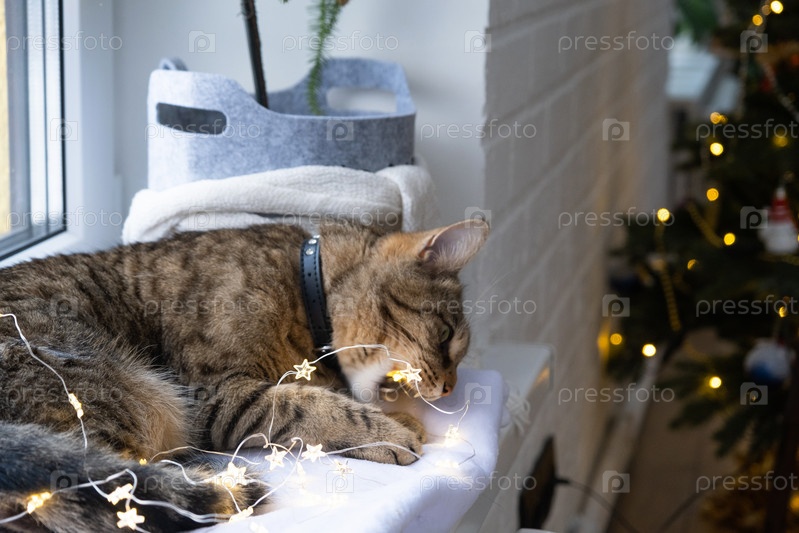 Кот грызет провода светодиодной гирлянды. Хулиганство домашнего питомца, саботаж, порча декора. Опасность для животного, поражение электрическим током. Рождество, Новый год