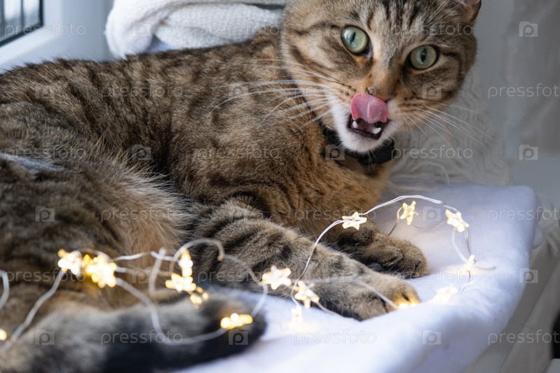 Кот грызет провода светодиодной гирлянды. Хулиганство домашнего питомца, саботаж, порча декора. Опасность для животного, поражение электрическим током. Рождество, Новый год