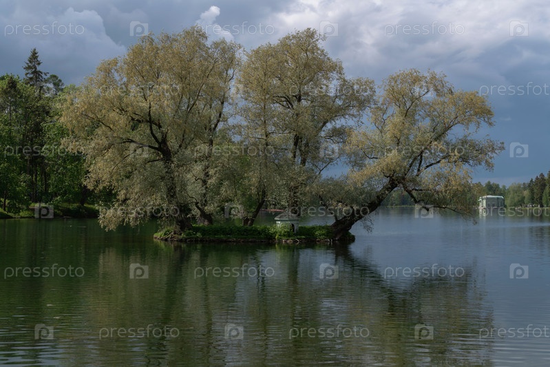 Небольшой остров на Белом озере с домиком для лебедей на территории Гатчинского дворцово-паркового комплекса солнечным летним утром, Гатчина, Санкт-Петербург, Россия