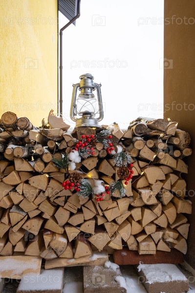 Дрова на заснеженном крыльце дома заготовлены на зиму. Отопление жилья печным камином, экономия электроэнергии и газа в кризис, экологичность