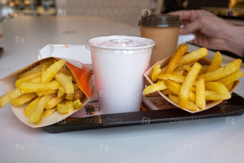 Фаст-фуд на подносе в ресторане. Картофель фри, стакан с молочным коктейлем, кофе