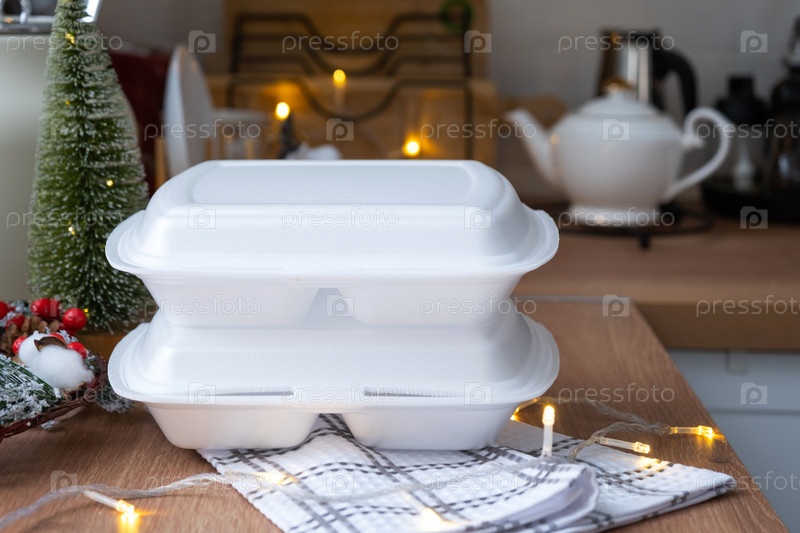 Контейнеры службы доставки еды на столе белая скандинавская праздничная кухня в рождественском декоре. Канун Нового года, экономия времени, лень готовить, горячий заказ, одноразовая пластиковая коробка в сказочном свете. макет