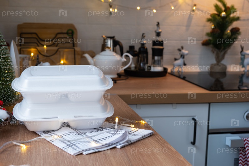 Контейнеры службы доставки еды на столе белая скандинавская праздничная кухня в рождественском декоре. Канун Нового года, экономия времени, лень готовить, горячий заказ, одноразовая пластиковая коробка в сказочном свете. макет