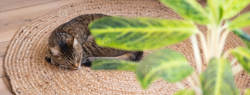 Кот крепко спит на джутовом коврике