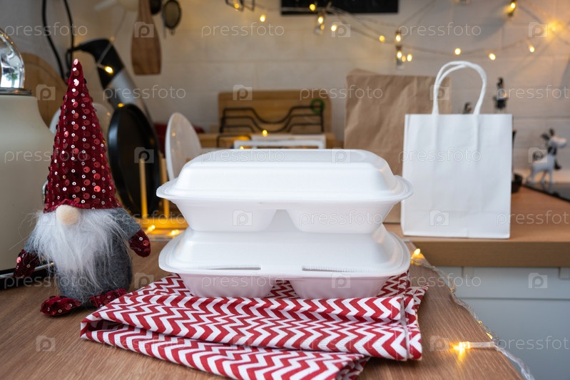 Контейнеры службы доставки еды на столе белая скандинавская праздничная кухня в рождественском декоре. Канун Нового года, экономия времени, лень готовить, горячий заказ, одноразовая пластиковая коробка в сказочном свете. макет