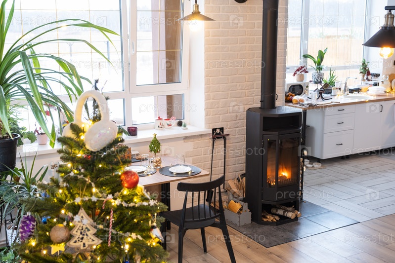 Праздничный интерьер дома украшен к Рождеству и Новому году в стиле лофт с черной печкой, камином, елкой. Теплая комната-студия с белой кухней, горящим деревом, уютом и отоплением дома