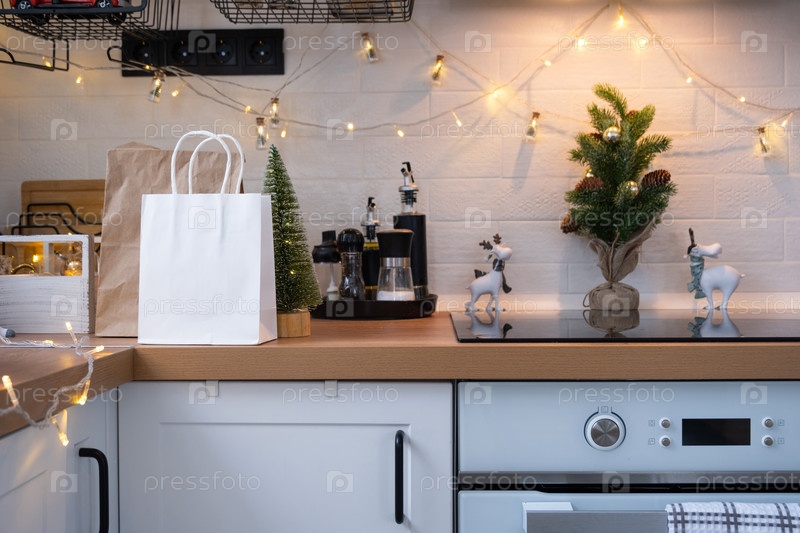 Контейнеры службы доставки еды на столе белая скандинавская праздничная кухня в рождественском декоре. Канун Нового года, экономия времени, лень готовить, горячий заказ, одноразовая пластиковая коробка в сказочном свете. макет
