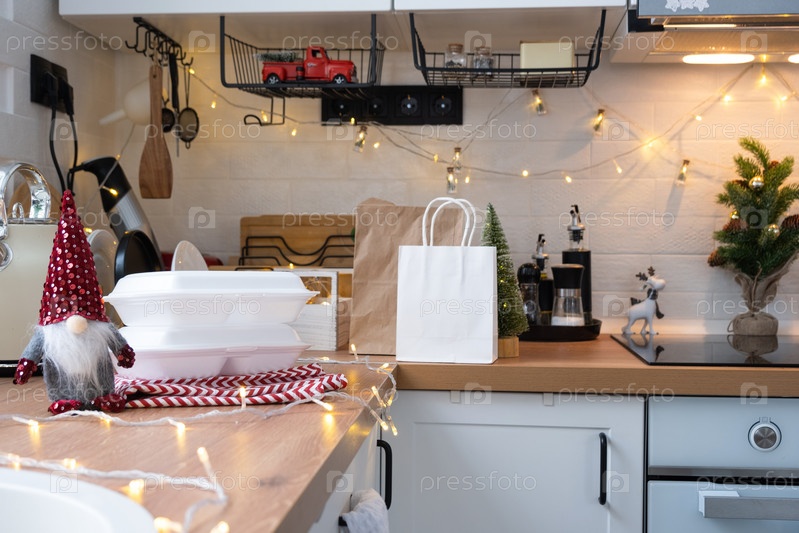 Контейнеры службы доставки еды на столе белая скандинавская праздничная кухня в рождественском декоре. Канун Нового года, экономия времени, лень готовить, горячий заказ, одноразовая пластиковая коробка в сказочном свете. макет