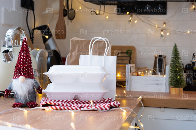 Контейнеры службы доставки еды на столе белая скандинавская праздничная кухня в рождественском декоре. Канун Нового года, экономия времени, лень готовить, горячий заказ, одноразовая пластиковая коробка в сказочном свете. макет