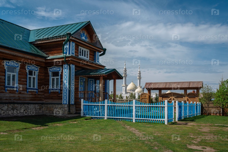 Дом Миллера в музее истории земледелия и производства хлеба и белая мечеть на заднем плане в солнечный день, Болгар, Республика Татарстан, Россия