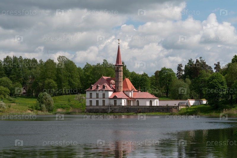 Вид на Приоратский (Приоратский) дворец на берегу Черного озера в летний солнечный день, Гатчина, Санкт-Петербург, Россия