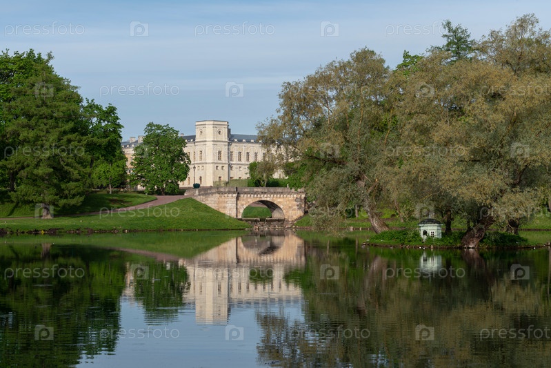 Вид на Карпин мост через каскад между Карпинским прудом и Белым озером Гатчинского парка и Гатчинский дворец на заднем плане в солнечный летний день, Гатчина, Санкт-Петербург Россия