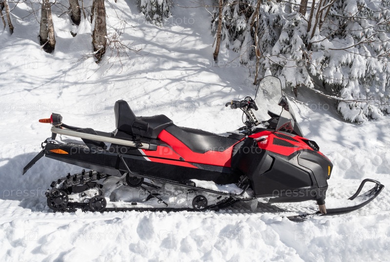 Вид сбоку на красный снегоход в заснеженном лесу в зимний солнечный день