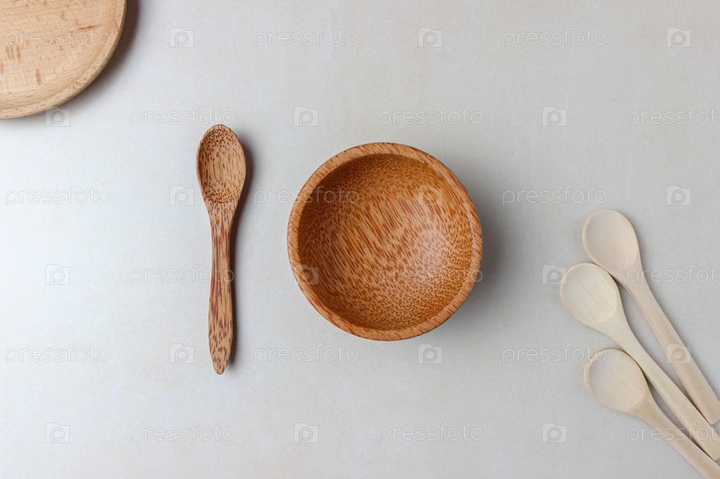 Деревянная посуда на кухонном столе. Круглые деревянные тарелки, деревянная ложка. Концепция подачи, приготовления пищи, деталей интерьера. Экологичный, натуральный, органический