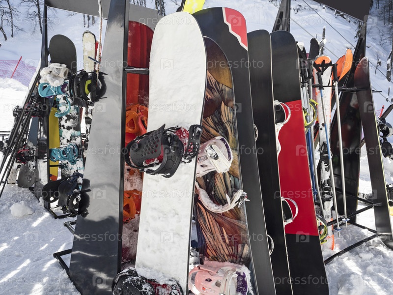 Лыжи и сноуборды опираются на лыжную стойку в солнечный зимний день