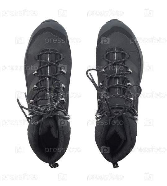 Вид сверху на походные ботинки или кроссовки на белом фоне