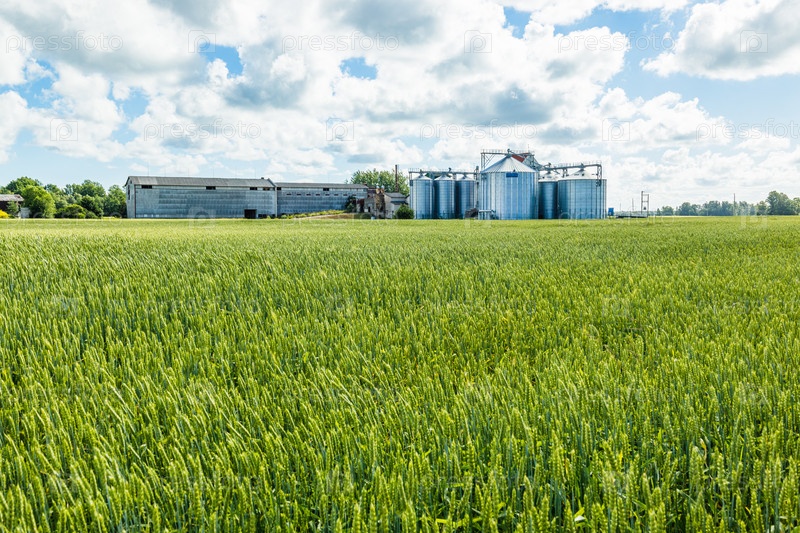 Зеленый свежесозревший полевой пейзаж с сельскохозяйственными зернохранилищами на заднем плане