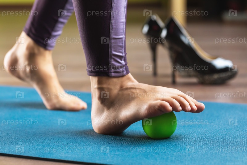 Женщина выполняет расслабляющие упражнения для мышц стопы с помощью массажного мяча для предотвращения усталости ног после ношения обуви на высоком каблуке