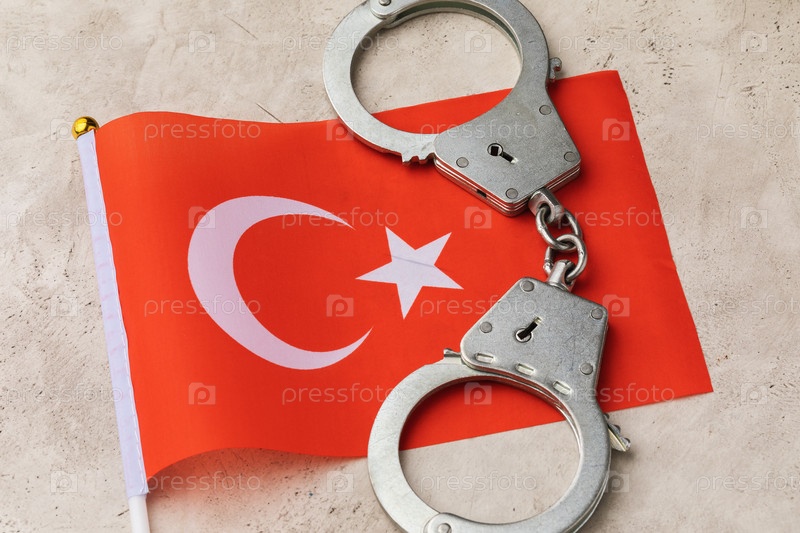Турецкий флаг и наручники на абстрактном фоне, понятие преступности в турецком обществе
