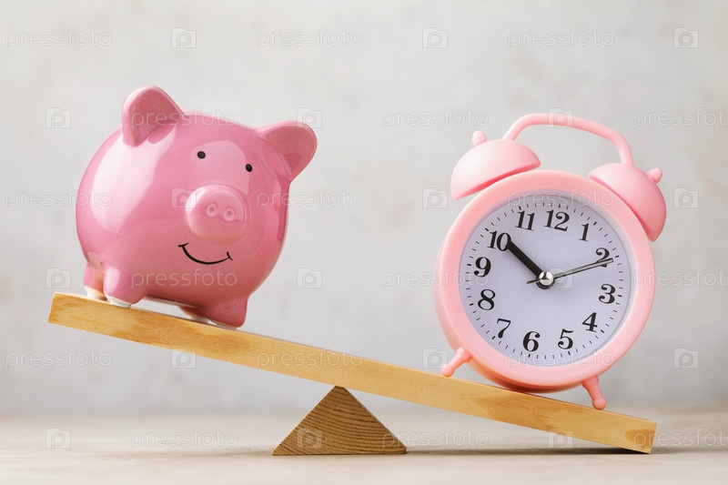 Будильник перевесил копилку на весах, концепция на тему экономии денег, время для экономии
