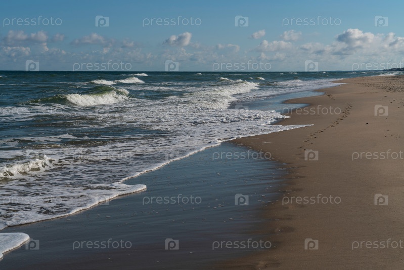 Вид на пляж Балтийского моря на берегу Куршской косы со следами на песке в солнечный летний день, Калининградская область, Россия
