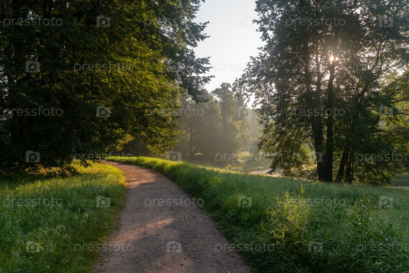 Вид на аллею в Павловском парке солнечным туманным летним утром, Павловск, Санкт-Петербург, Россия