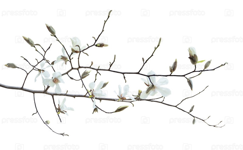 Цветущие цветы магнолии на ветке дерева на белом фоне