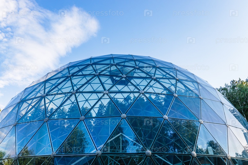 Изогнутая крыша фасада из структурного стекла пирамиды Меркине в Литве