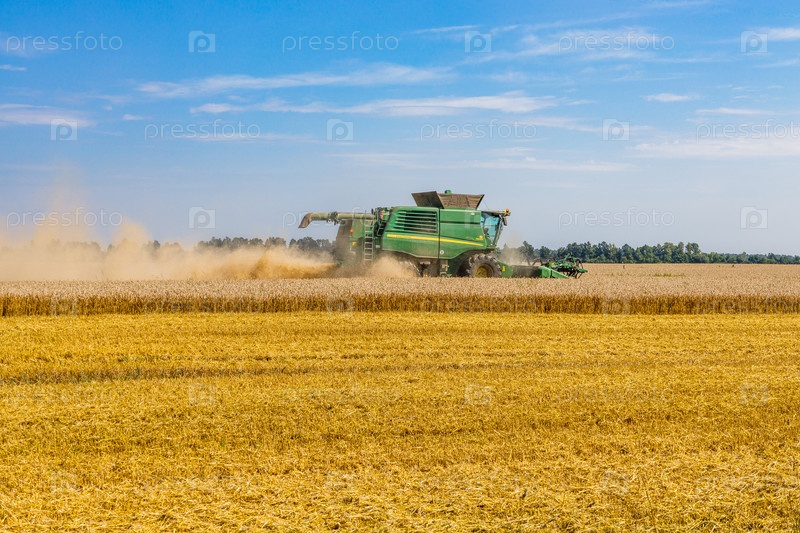 Сельскохозяйственное пшеничное поле с комбайном в рабочих процессах. Симнас, Литва, 15 августа 2022 г