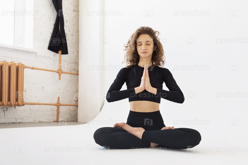 Молодая красивая женщина, практикующая йогу, занимается медитацией, сидит в позе лотоса с намасте, тренируется в черной спортивной одежде в светлой комнате