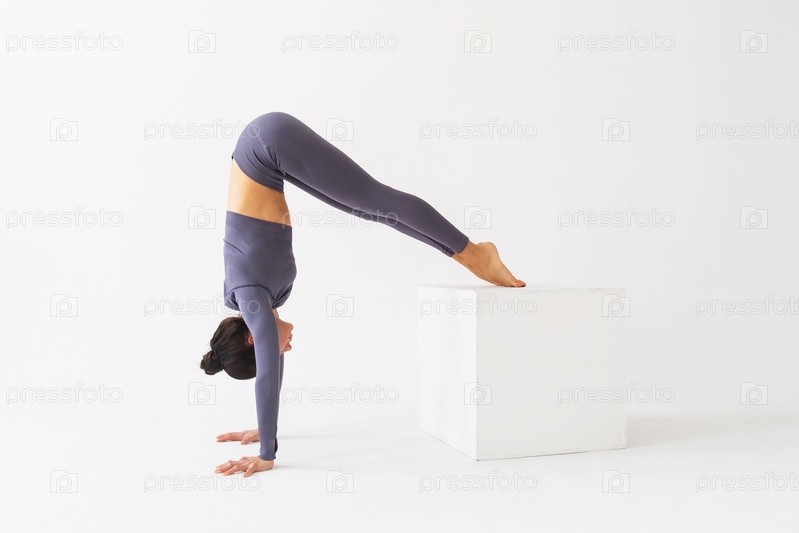 Женщина в спортивной одежде выполняет стойку на руках и опирается ногами на куб на белом фоне