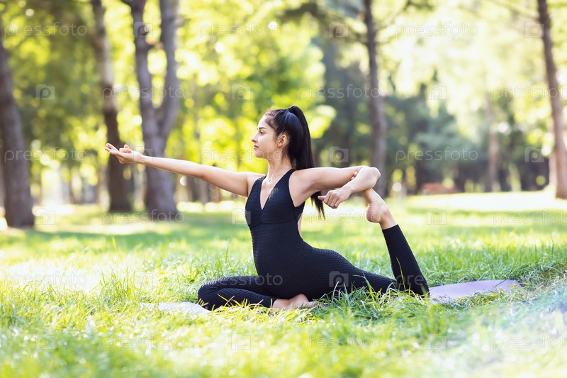 Молодая беременная женщина в черном спортивном костюме занимается йогой, делает вариацию упражнений Эка Пада Раджакапотасана, позу голубя, тренируется сидя на коврике в парке солнечным летним утром