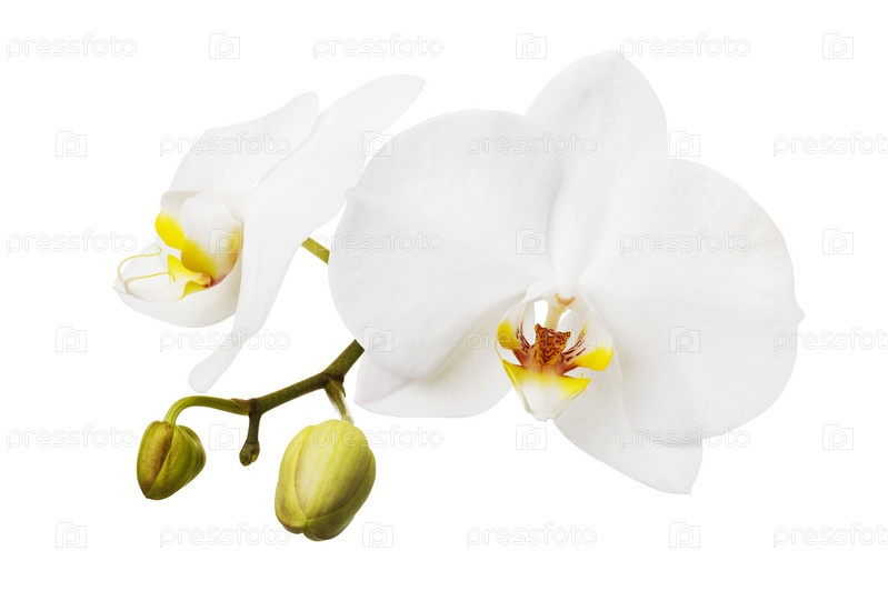 Ветка цветущей белой орхидеи с желтым цветом на губе. Изолированные цветы