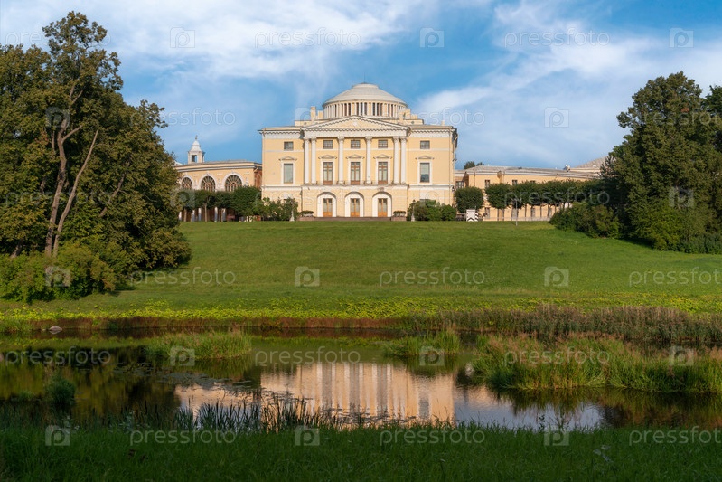 Вид на Летний дворец в Павловском парке с реки Славянка в солнечный летний день, Павловск, Санкт-Петербург, Россия
