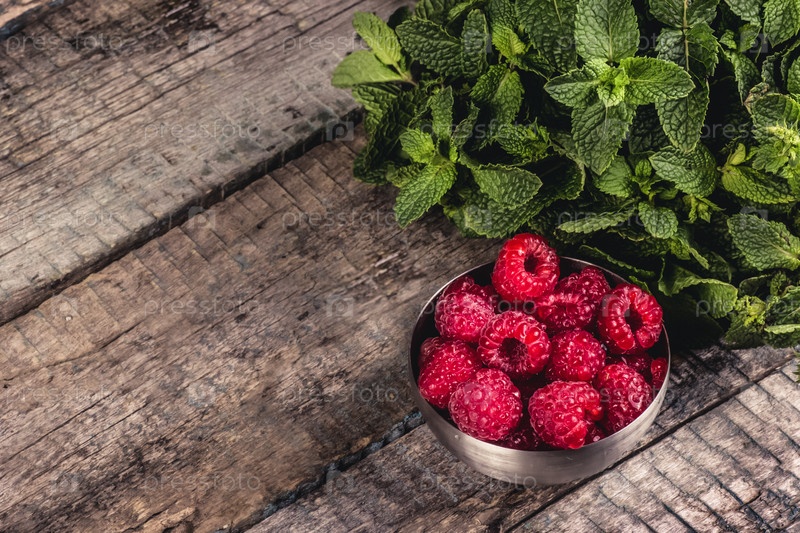 Чаша со свежей вкусной сочной малиной на деревянном фоне