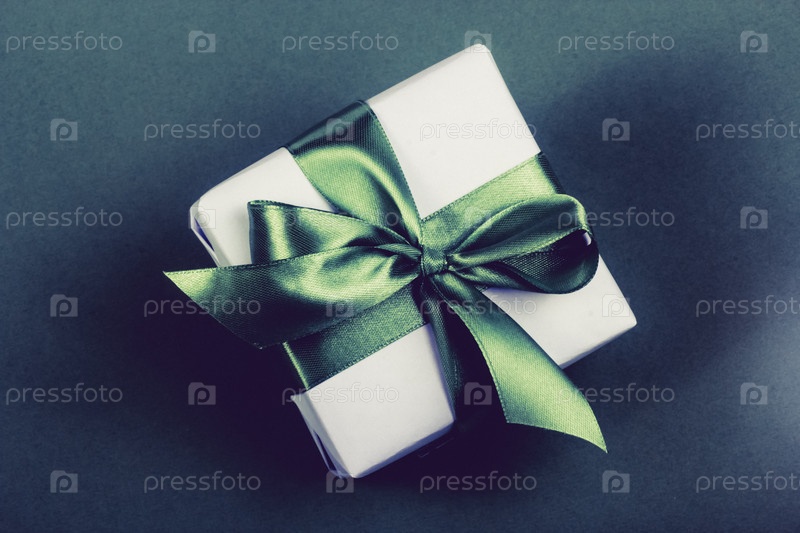 Подарочная коробка с зеленым бантом на темном фоне