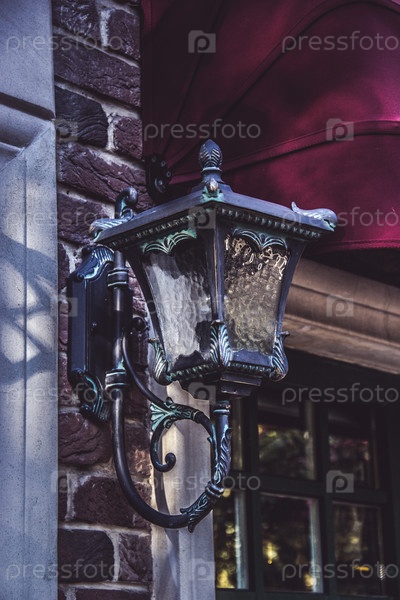 Старинный железный уличный фонарь на кирпичной стене