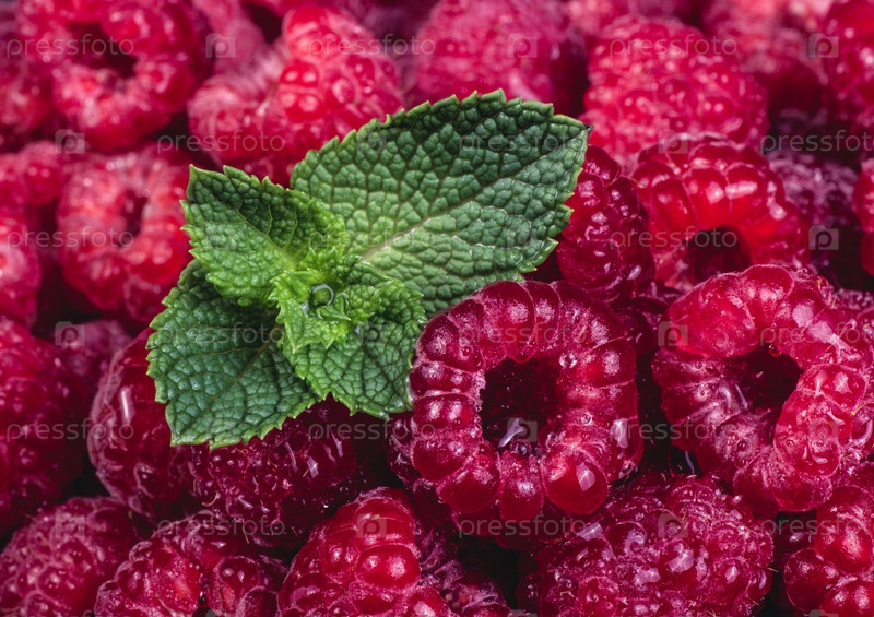 Свежая спелая сладкая малина и мята. Малина крупным планом