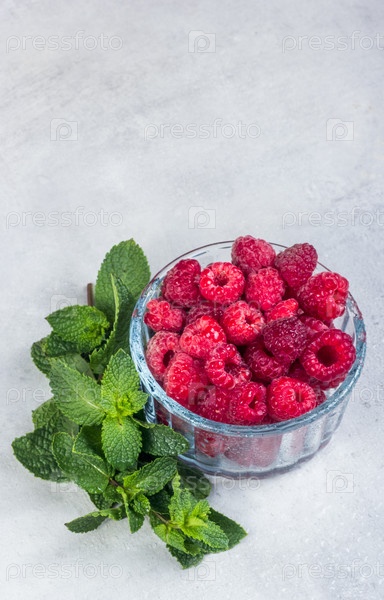 Чаша сочной малины и мяты на сером фоне