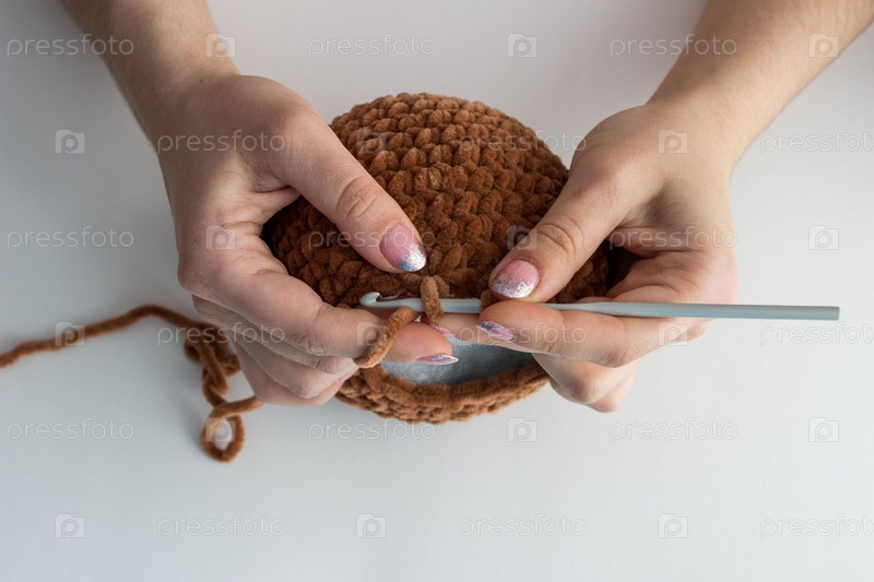 Процесс вязания детской игрушки из плюшевой пряжи. Вязание головы. Ручной работы