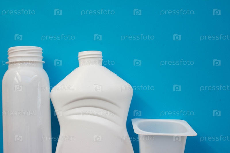 Белые пластиковые бутылки на синем фоне с местом для вашего дизайна. Вид сверху