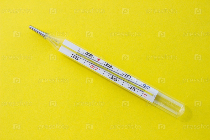 Ртутный термометр на желтом фоне. Один объект
