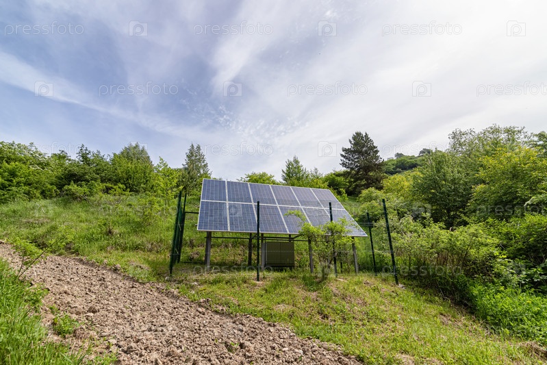 Большая солнечная панель установлена в парковой зоне среди леса