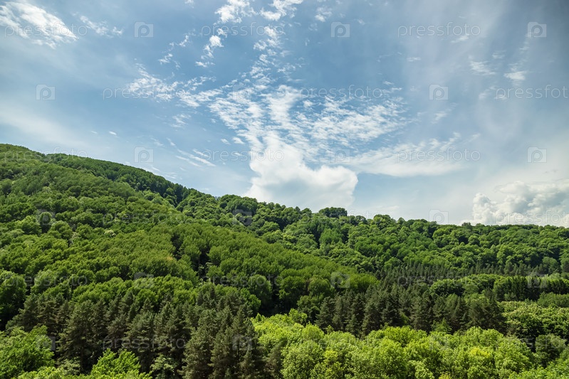 Огромный изумрудно-зеленый лес под голубым небом с облаками