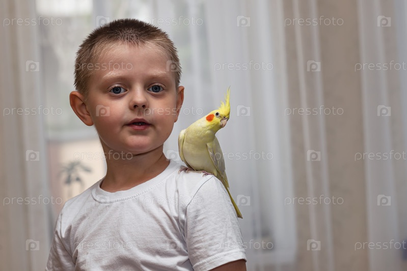 Домашний попугай корелла сидит на плече маленького мальчика