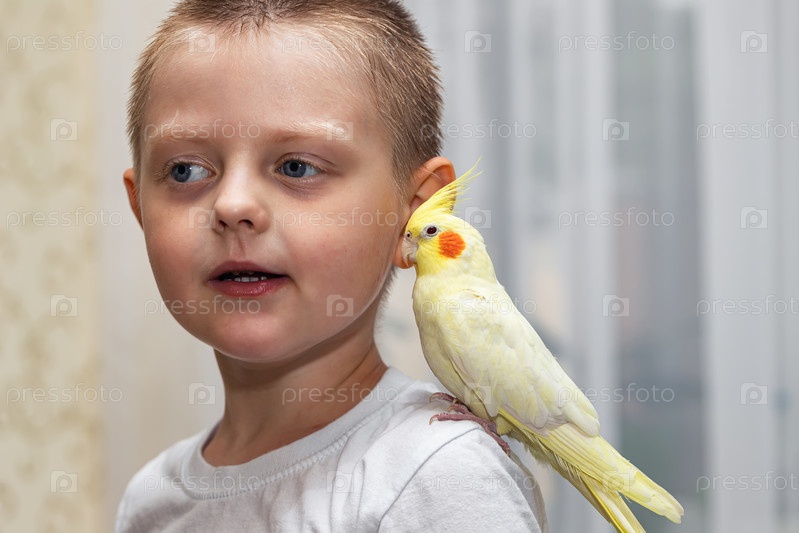 Домашний попугай корелла сидит на плече маленького мальчика