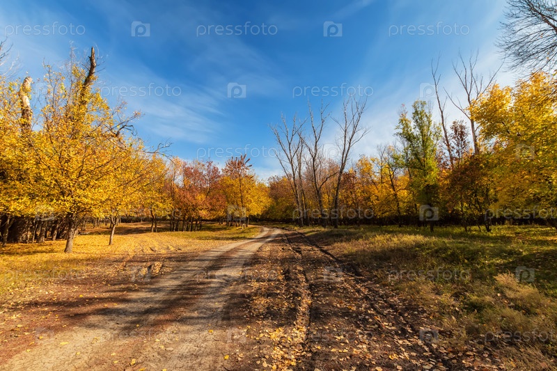 Грунтовая дорога проходит через осенний лес