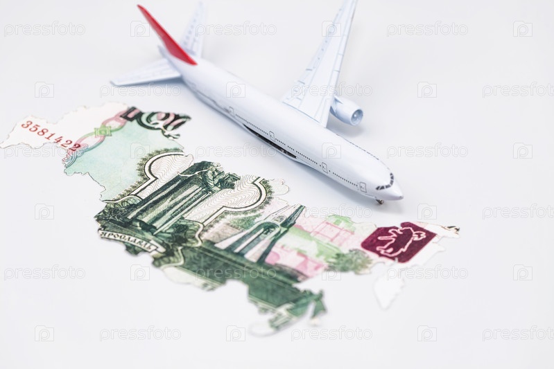 Сломанная модель пассажирского самолета без крыла лежит возле трафарета границы Российской Федерации. Россия вырезана из банкноты 1000 рублей