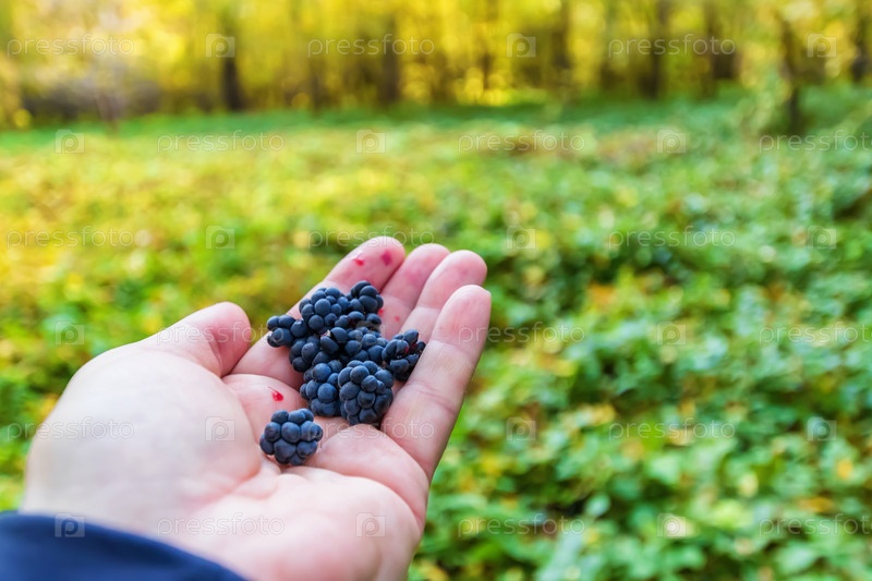 На ладони лежат спелые ягоды дикой ежевики, собранные в осеннем лесу